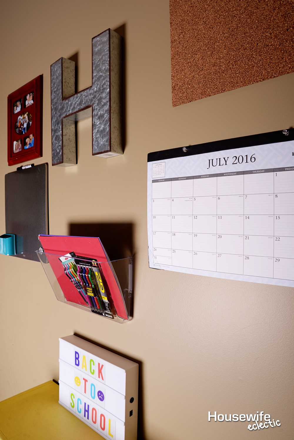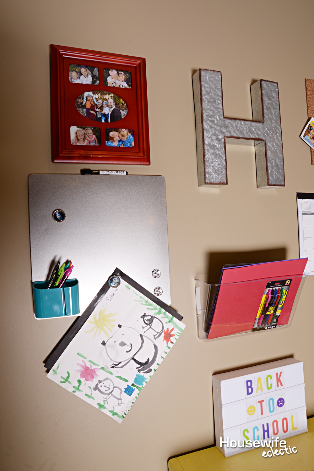 I found everything I needed in a quick trip to Walmart including the cute tin letter H for our last name. I hung everything with velcro strips and was able to get everything on the wall in just a few minutes. I love the way it turned out and almost everything was right in the office supplies aisle. The cork came in a pack of four, so if you wanted to have more cork tiles or a cork tile for each child, it would be really easy to do.