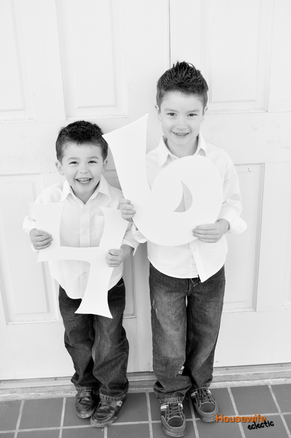 Letters are perfect for annual photos, helping mark the age that the child is at. I have a set of white letters shown in these photos that I bought at Hobby Lobby. They are normally $2.99 a letter but often go on sale for half off. Don’t want to buy letters? You can make large letters or numbers out of foam core as in the photo below. Trace the letter or number on foam core and simply cut it out. You could do the same with poster board, but it won’t be as stable.