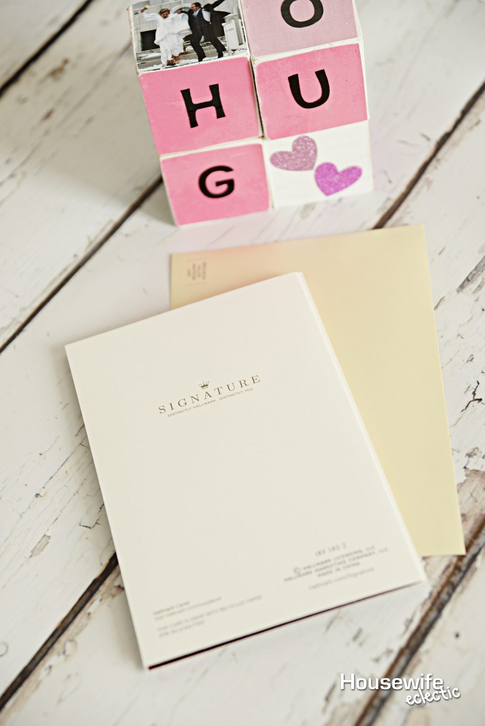 These blocks are so darling and could be personalized with names and pictures of your children as well. I kind of want to make a set with pictures on each side of my husband’s office. Valentine’s Day is coming fast and these blocks are a quick and fun craft that anyone would love to receive, just pair it with a Hallmark Signature card and you have the perfect and memorable gift.
