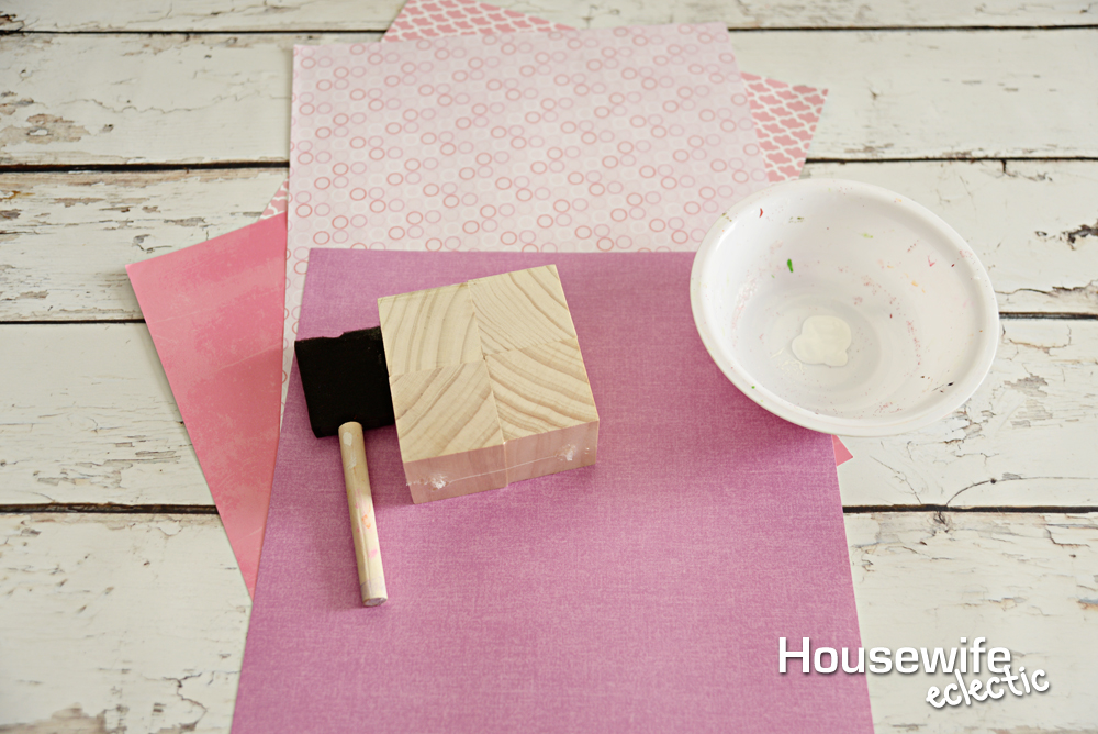 Add a thin layer of Mod Podge to the sides of the blocks and secure the paper to each side.