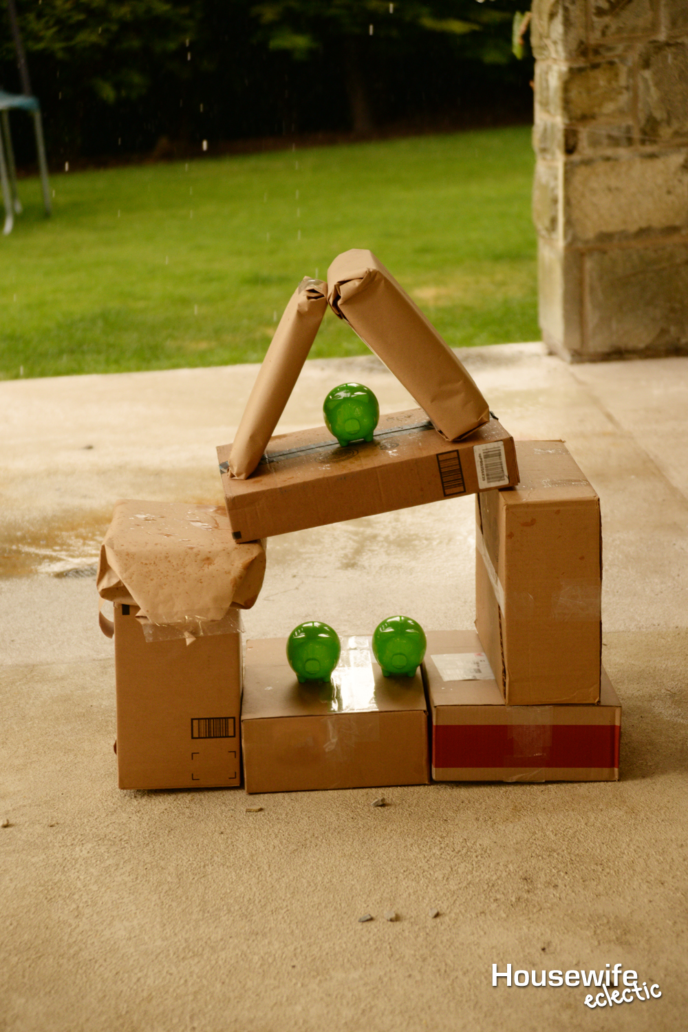The dads were in charge of building the boxes back up again and they came up with some pretty creative configurations. As much fun as it was to knock over the boxes, I think the little plastic pig banks added the perfect touch.