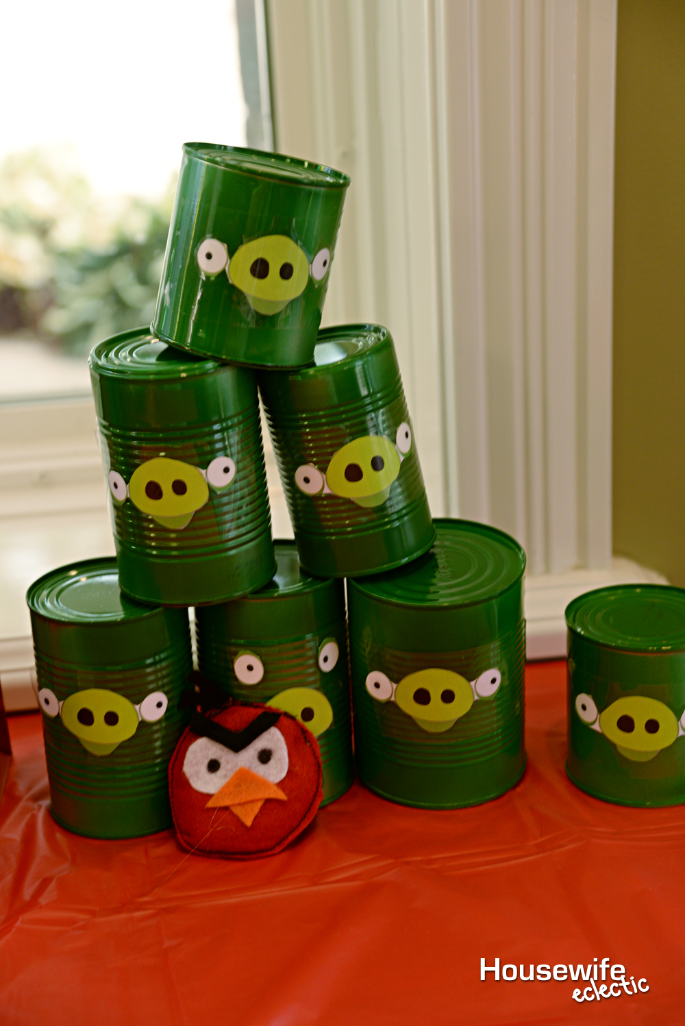 I actually made two different kinds of Angry Bird toss games. I made this version out of tin cans, green spray paint and small printable pig faces. This smaller tin can game is perfect for smaller spaces or for smaller kids. Since our party was going to be attended by both older kids and toddlers, I made the little ones their own version with a cute little handmade bean bag to go with it.