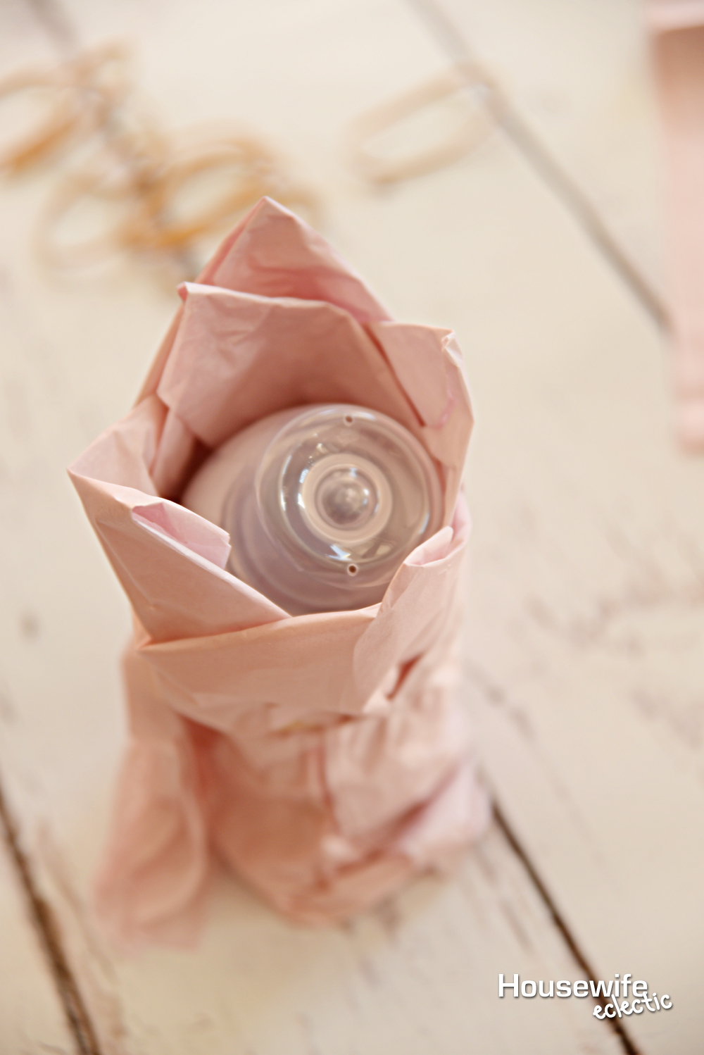 Take a rectangle of tissue paper and fold two of the edges together so they make a point (like the first step of making a paper airplane). Wrap the tissue paper around your bottle with the point side up (and above the top of the bottle) and use a rubber band to secure it.