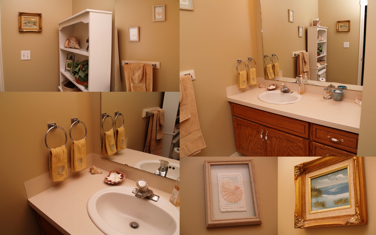 While I was there a few weeks ago, the process of restoring parts of the house began. The downstairs bathroom went with a beach theme. We used large shells as the central points in the design and a sandy colored wall paint to tie it all together.