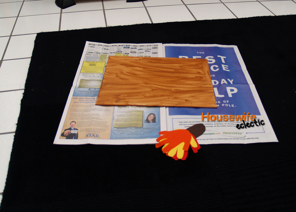 Paint your canvas. I did a simple streaky brown because that is the look I was going for. If you wanted you could paint a farm scene for the turkey to be apart of. Starting with the feathers that you want to be at the very back, Mod Podge the hands onto the canvas. I started with the yellow hands and then place the red hands on top and then the orange. I finished with the turkey body.
