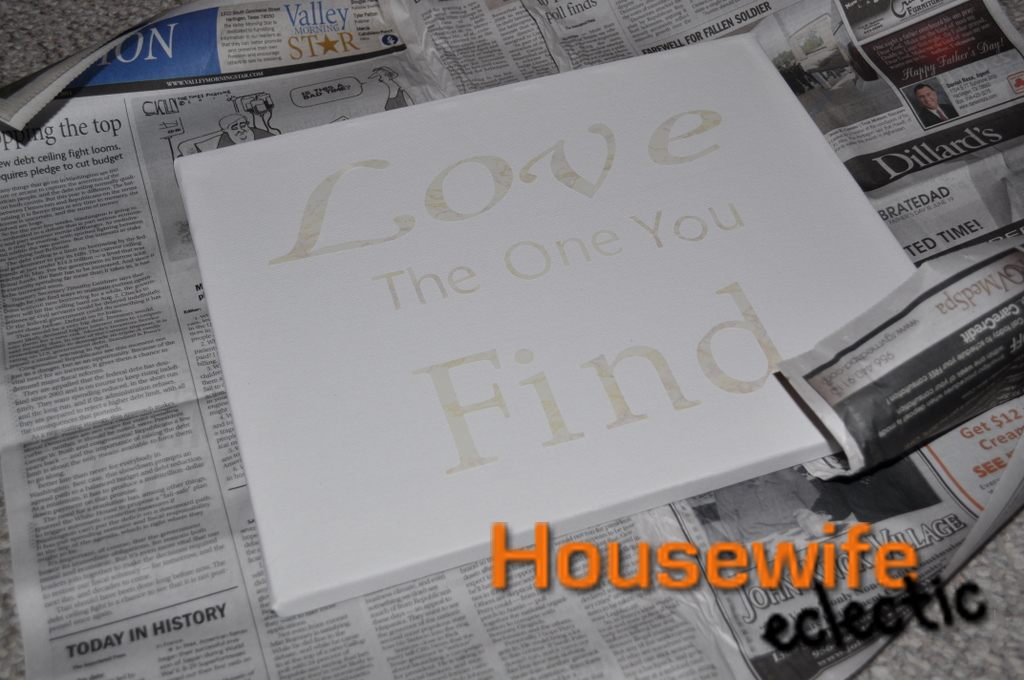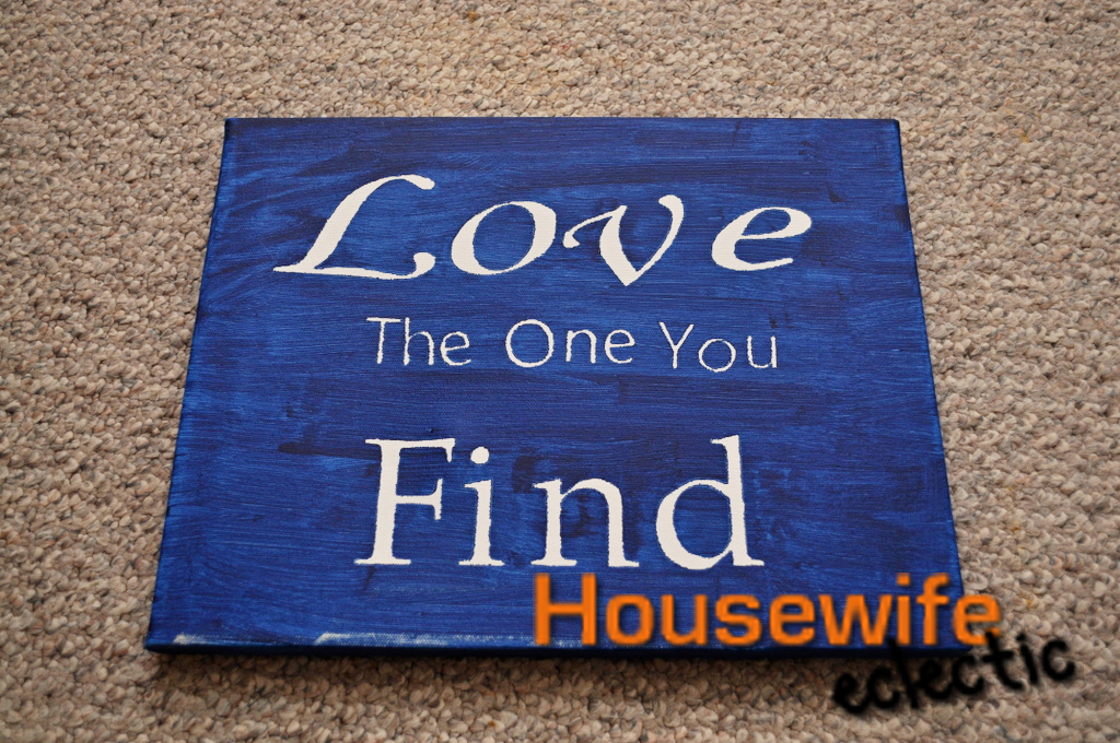 After the canvas is COMPLETELY dry, pull the letters off and you have a gorgeous canvas to hang in your home. I hung my canvas in my bedroom and I love the way it looks. This saying has special meaning to my husband and I because it was something the man who married us said to us during our ceremony. He told us that it was no longer time to keep trying to find the one we loved but love the one you find.