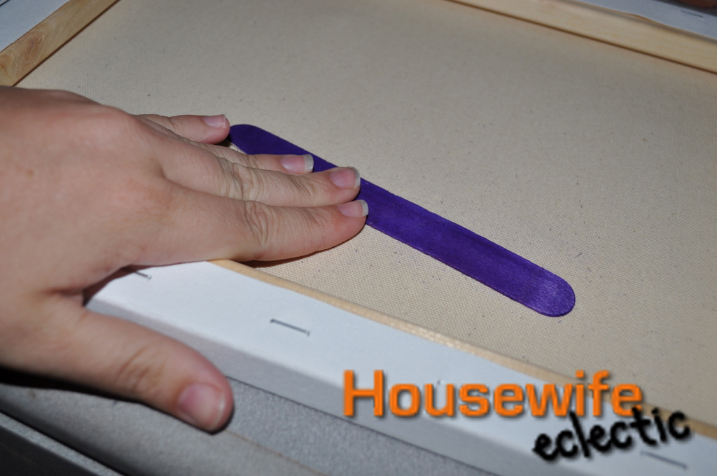 Apply the contact paper to your canvas. Some people like to use transfer tape, I actually had better success placing the letters individually. After they are on your canvas, flip it over and rub a Popsicle stick over the back to make sure the letters are firmly on the canvas.