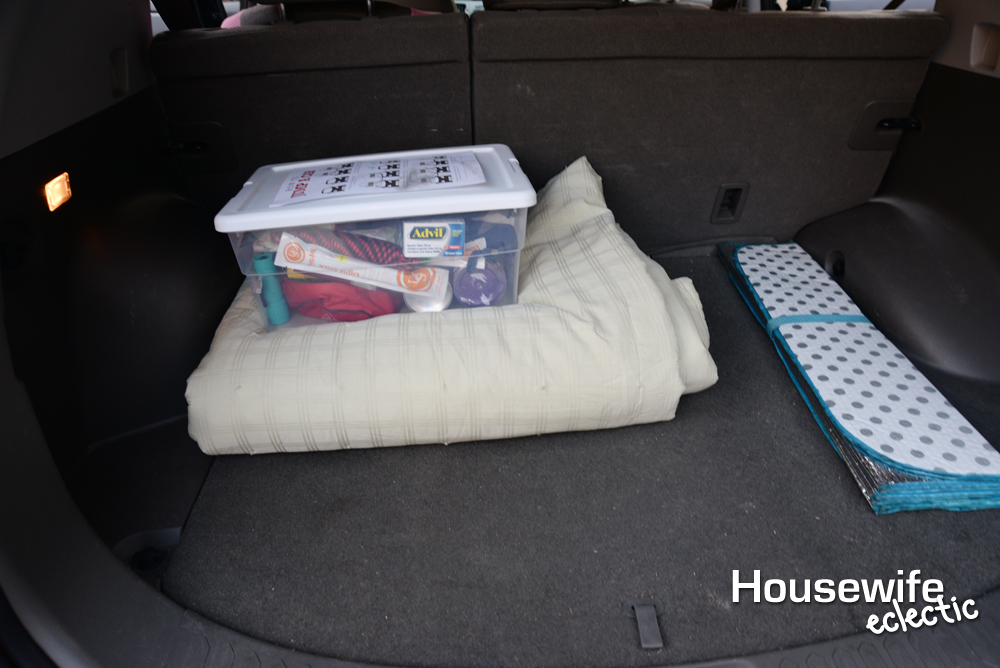 I am lucky enough to have a car organizer in my trunk but all of this fits nicely in a plastic container too.