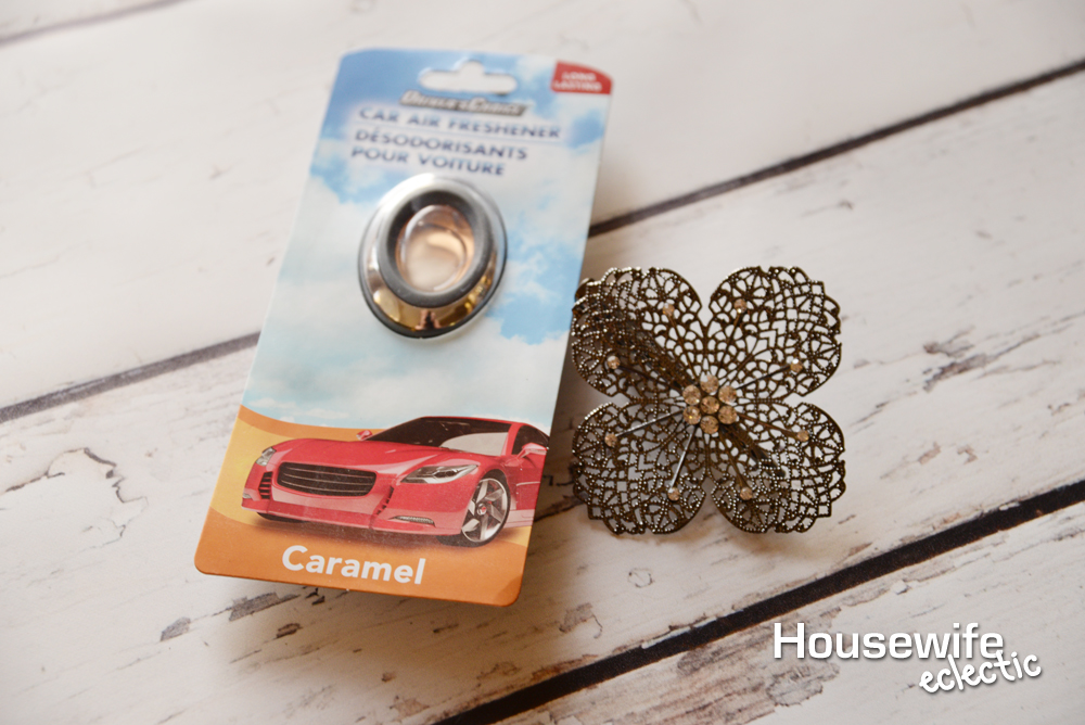 Grab a cheap air freshener from the dollar store and a cute hair clip. Take the plastic clip part out of the freshener and break the clip off the back of the hair clip.