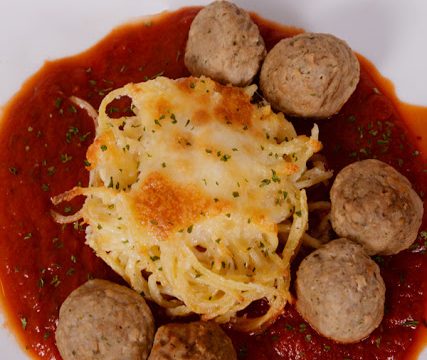 Baked Spaghetti Alfredo with Meatballs in Marinara