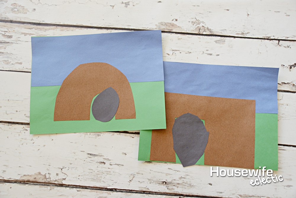 Create a sky and grass background by cutting a piece of blue paper in half and gluing one half to the top of a green paper. Cut a tomb out of brown paper and the large stone out of black paper. Glue both to the background.