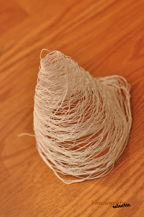 I personally prefer the glue method. It is a little messier, but I think a little sturdier. Pour a little bit of glue on a paper plate. Dip your fingers in the glue and slide them along the thread as you wrap the thread along the cone. Repeat for the entire cone. Wait until the glue dries, and then slide the thread tree off the cone.