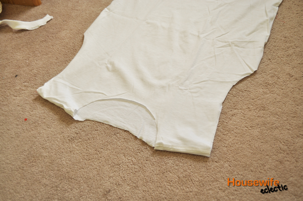 The first thing you need to do is cut the neck and sleeves of the shirt off. Don’t discard them, we will use them later. Make sure when you are cutting the collar, that you just cut the collar. You want to leave the material on the back, or it will dip down just like the front.
