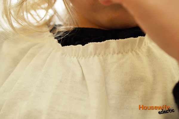 Now with your new smaller arm hole, repeat the same steps you followed for the neckline, using a piece of elastic that will fit comfortably around your child’s arm.