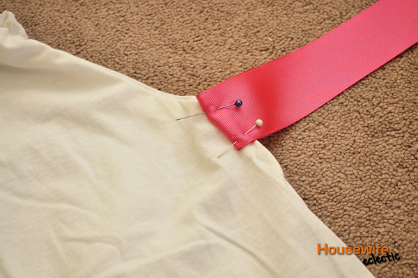 Now here is where we fix the weird points on the sides of the dress. Take a length of ribbon, long enough to tie a bow and, fold the unfinished edge over and then fold one more time, so the edge is hidden inside. Pin to the area of the dress that comes to a point and sew. Repeat on the other side.