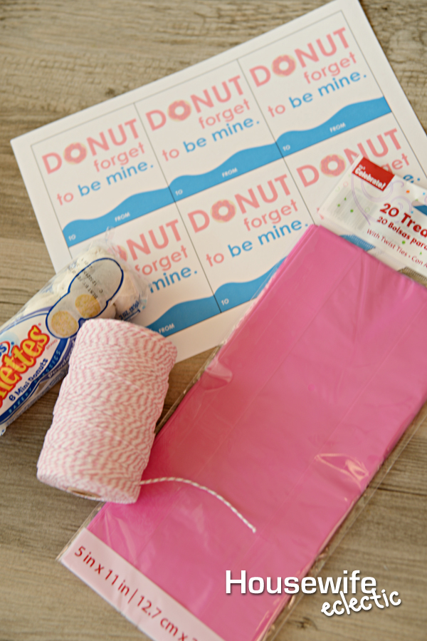 Print and cut out the printable Valentine. Have your child address them. Punch a hole in the corner of each Valentine. Add a couple of donuts (we used the Hostess Donettes) to a cellophane bag.