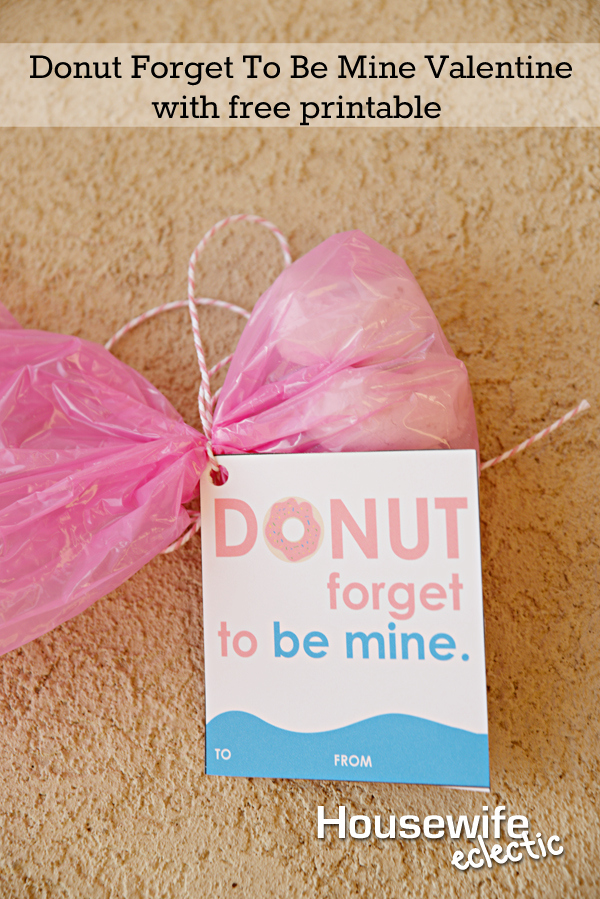 You can do entire packages of small donuts, or any other thing that has donuts on them. At the dollar store we found donut stickers and donut socks, so it doesn’t have to be an actual donut. We have even made fun little donut necklaces in the past out of washers. Thread the twine through the printable and then tie it around the bag and you have a fun and tasty Valentine.