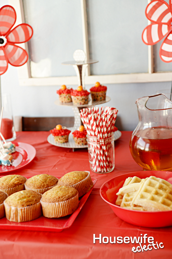 Since we had our party in the morning, I wanted most of the food to be breakfast food, with a few snacks. One side of the table had a big plate of waffles and the other side of the table I had a bowl of strawberries, raspberries and bananas to top the waffles with. In the middle of the table, I had a large plate of muffins and on the other side, waffles. For drinks I filled a pitcher with apple juice and put out red striped straws to match.