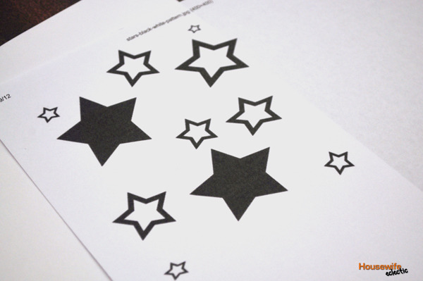 Find some stars you like on the internet and cut them out. I liked the big dark stars on the page below. Use this as a pattern to cut stars out of white felt. I did five stars, remember things always look better in odd numbers to our eyes. When you have your stars, slide a straight pin straight through the middle and then push them into your wreath on top of the blue. I used straight pins for the stars because I live in a very windy place.
