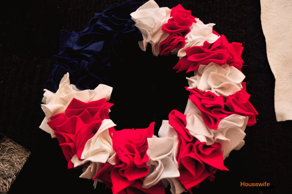 Fill in the blue the same way you did the red and white, until the wreath is completely full.