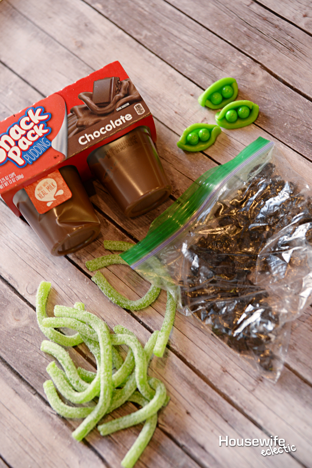 Place the little peas on top of the cookie dirt and add some sour straws for vines.