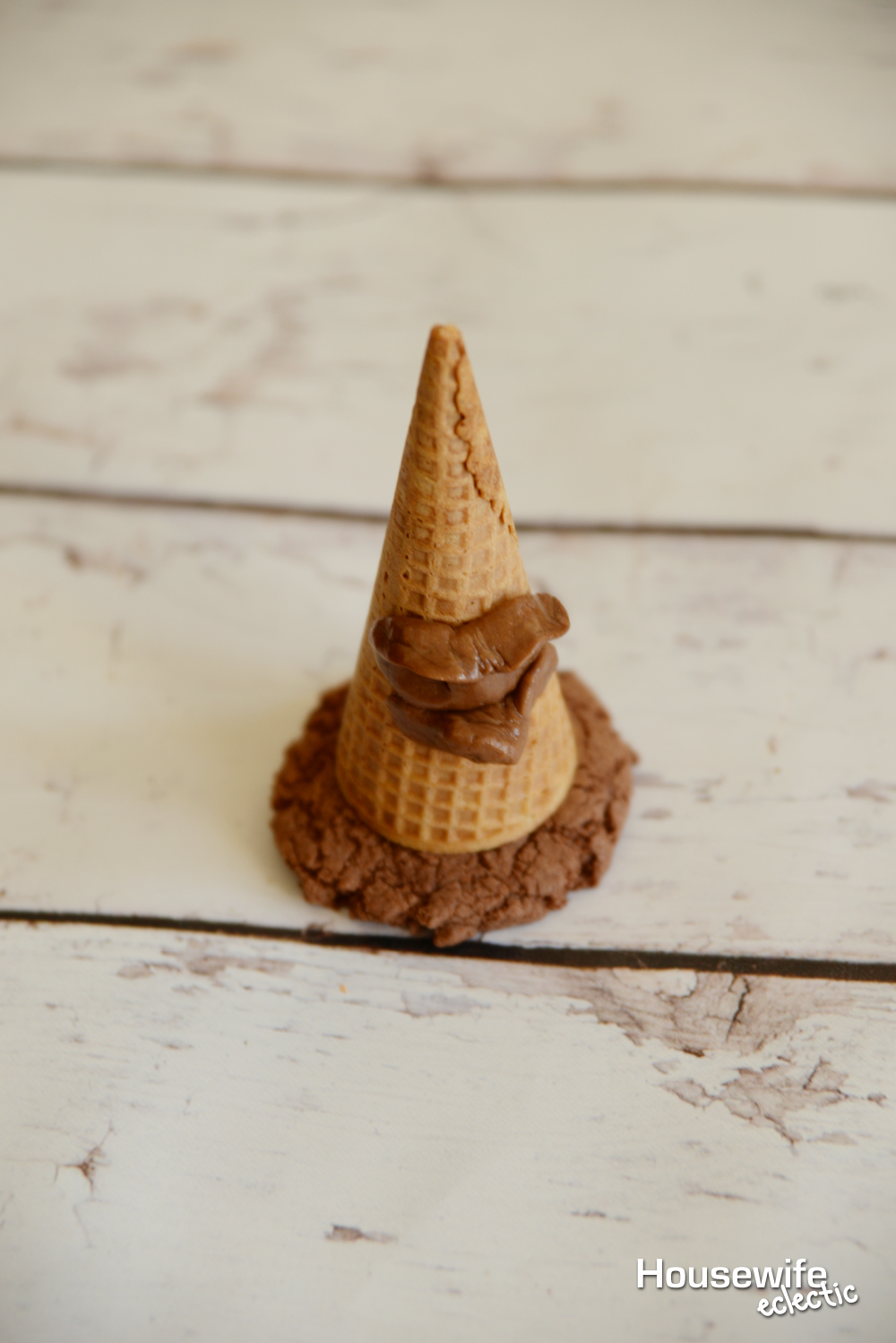 Work the chocolate candy rolls with your hands until they are soft and you are able to mold them. Each Sorting Hat face took about three chocolate rolls. Two for the eyebrow line and one for the mouth line. You aren’t working to an exact science, just working to give it a little bit of a face. You can find Sorting Hat pictures here, to get a better idea of what you are working towards.