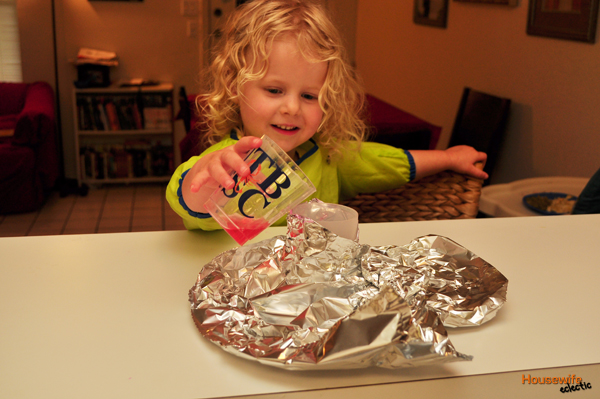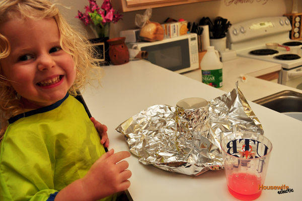 Wrap you cup in tin foil, creating a mini mountain. I do this for two reasons. One we can talk about how some mountains are volcanoes and some are not and two, it is easier to clean up.