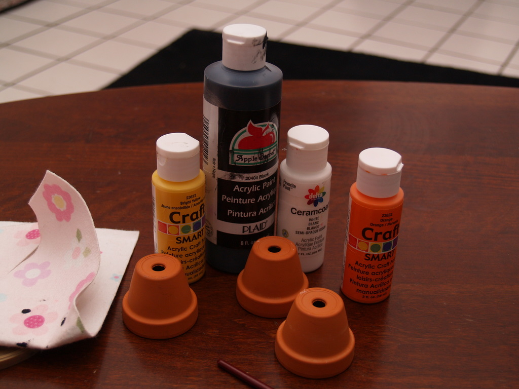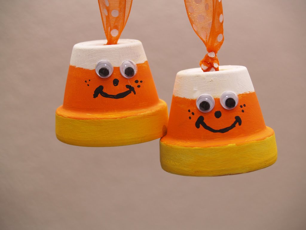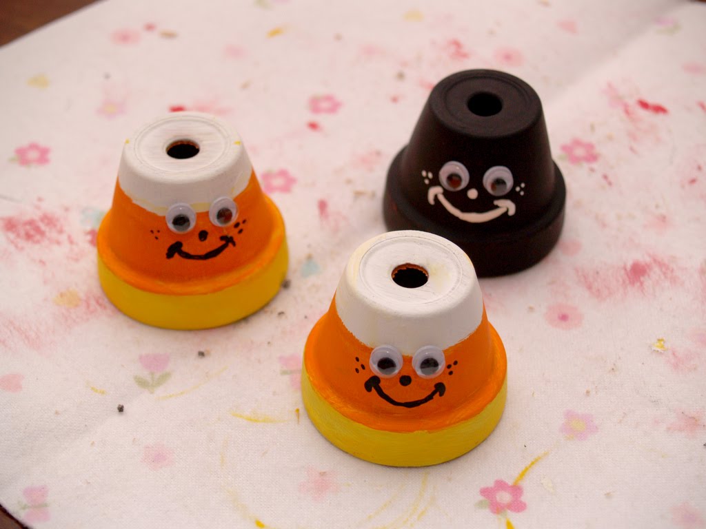 I painted my candy corn pots with a couple of layers of white paint before I added the other colors. I then painted them to match candy corn pattern before I added the eyes and ribbon.