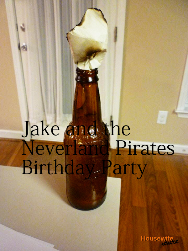 Did you just love the my sister’s Lego party that I shared last week? I am back with another one of her parties this week, this one is her Jack and the Neverland Pirates Party. The invitations are above, pirate maps in a bottle (IBC bottles to be exact).