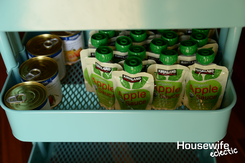 The first tier on the car is for grains. Usually for us this is filled with Fig Bars and Nature Valley Granola Bars. We also tell our daughter she has the option of making herself a sandwich if she doesn’t want to grab something from the top shelf.