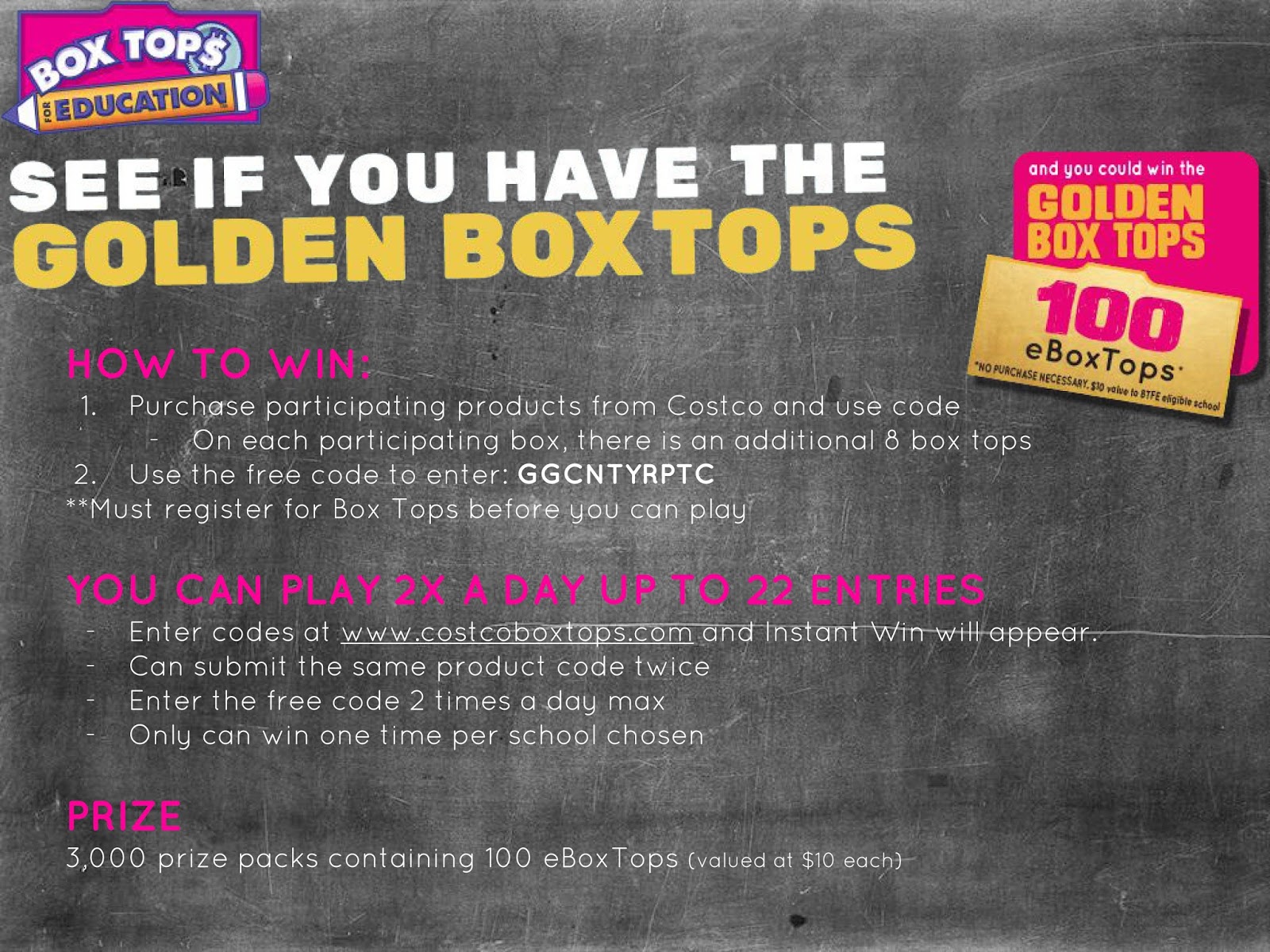 Right now at Costco, when you specially marked General Mills products, there will be an code on the packaging that you can enter at www.costcoboxtops.com to see if you have won your school an extra 100 Box Tops!