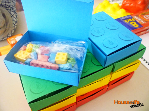 The favors were little origami boxes with Lego circle printed on them with Lego candy inside.
