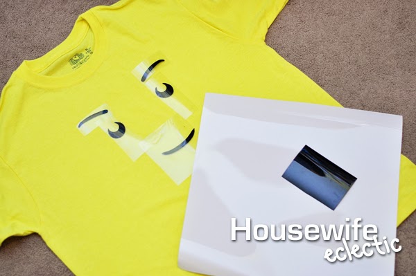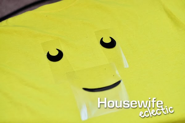Weed the both the white and the black designs. Place the black heat transfer (always start with the bottom layer) on your shirt with the carrier sheet up. You can see in the image above how I have individually placed each part of the image. When doing this, just measure the distance from your elements to make sure the mouth is the same distance from each eye and so on. Iron directly onto the carrier sheet for about 15 seconds. Peel the carrier sheet off, leaving the design on the shirt. Line up the white circles over the eyes. Go slow, you might want to give the black a few minutes to cool before you try to line up the white, so it won’t stick right away.
