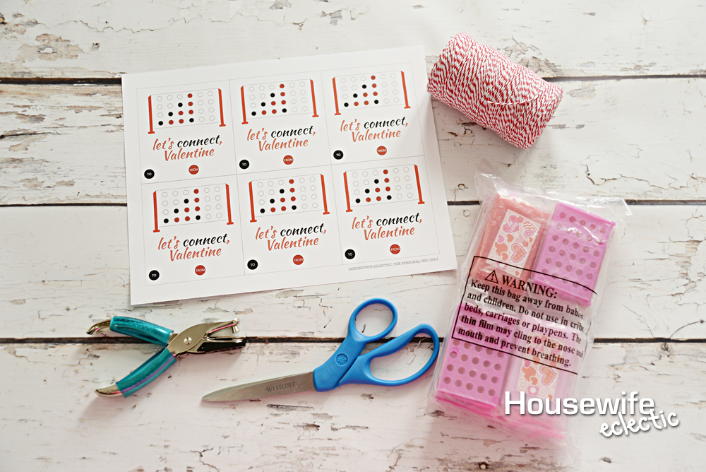 Print and cut out the paper valentine. Have you child address them to each child in their class. Using the single hole punch, punch a hole in the corner of each valentine and a hole in the corner of the Connect Four bag. There should be plenty of space to punch a hole above the seal so none of the little pieces fall out.