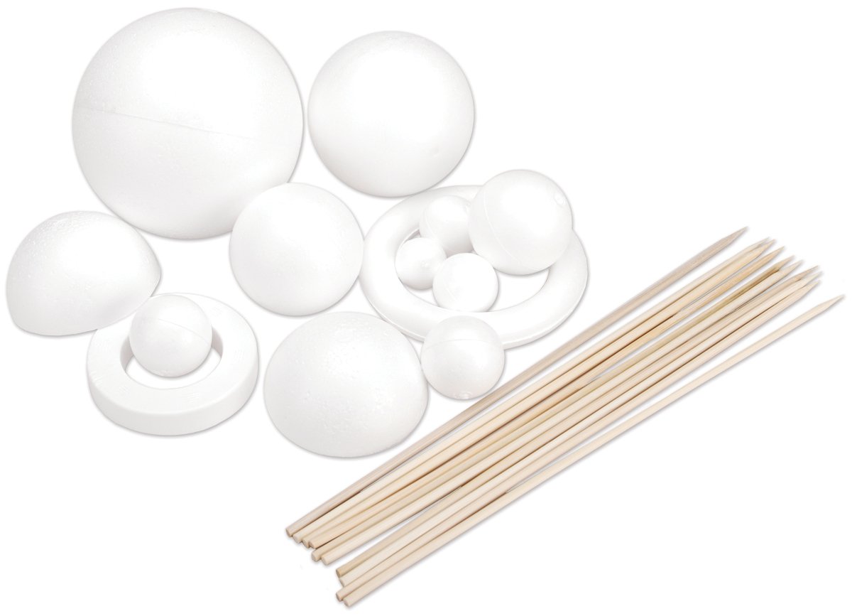 - After your dress is done, you can start work on Ms. Frizzle’s headpiece. Paint all of the Styrofoam planets as the box directs you. When they are dry, make a circlet of thick wire that fits on the head of the person who is going to wear the costume. Close the circle by twisting the wire together. Stick a piece of wire a couple inches long into each planet. Secure the wire with hot glue. Twist the other end of the wire around the large circle of wire, creating a planet head piece.