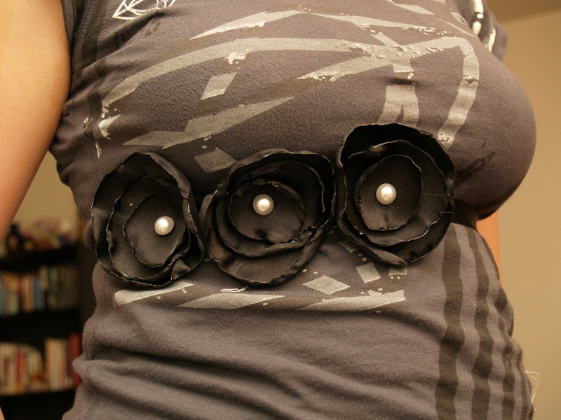 I have seen these belts all over the web but since I can’t afford to spend money on a ribbon/flower belt, I made up my own. I made three of the flowers, with three layers each. I then found a piece of satin ribbon and measured it so that it went just over the length of my torso.