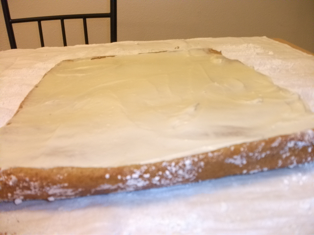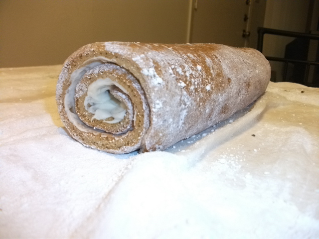 8. When the roll is cooled, gently unroll it. Spread the filling