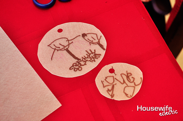 I use a cup to trace a circle on the Shrinky dinks and then cut them out. I had my daughter draw a picture of her and my Mother-in-Law together on one circle and then on a smaller circle she wrote “I Love You.” For her last circle, she drew a picture of a rainbow. Make sure to trace your outline and write on the smooth side of the Shrinky Dinks, you can color in your picture on the other side.