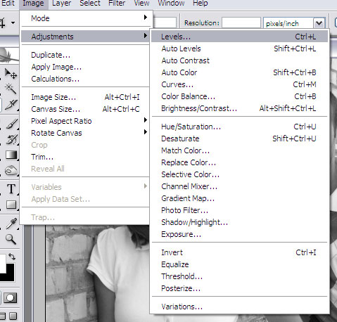 Step 4: To add some depth and shadows to your photo, go to the Image menu, down to Adjustments and select Levels…