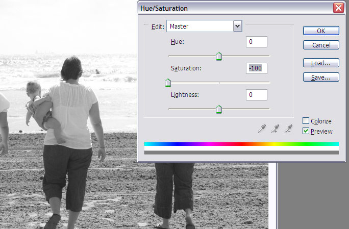 Step 2: Go to the Hue/Saturation palette by going to the Image menu, down to Adjustments and click on Hue/Saturation…Step 3: Drag the Saturation slider down to -100. Your photo should be in black and white now. Press OK.