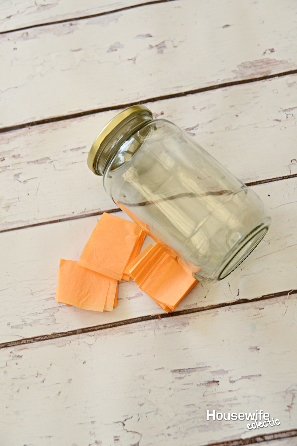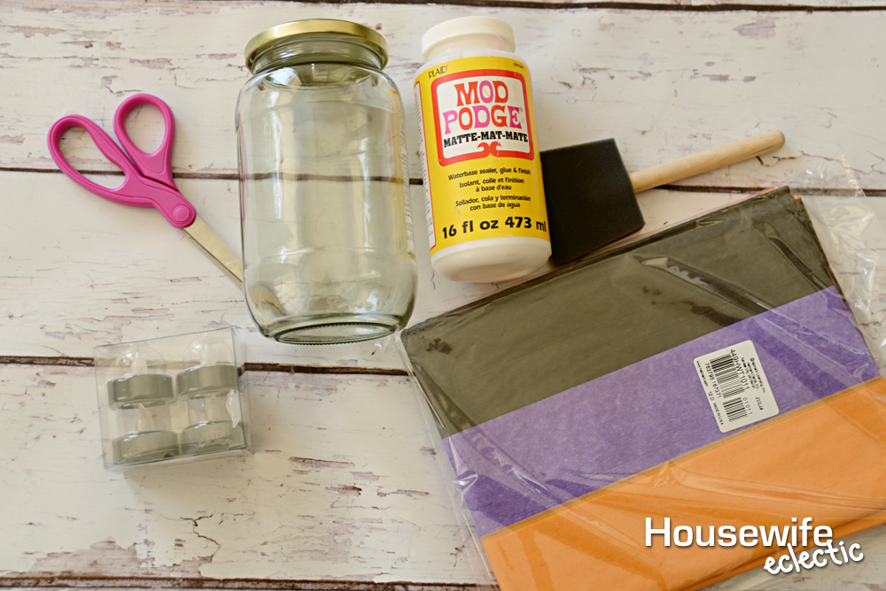 Cut your orange and black tissue paper into squares. One you have a bunch of squares you can start applying them to the jar. Add a layer of Mod Podge and then smooth tissue paper onto the jar, layering the tissue on itself as you.