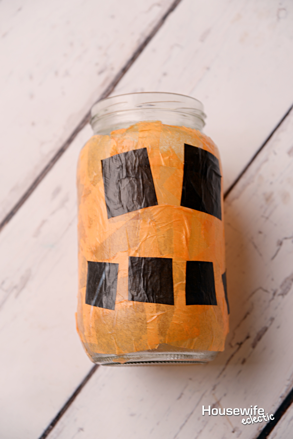 Allow the orange tissue paper to dry completely and then add the black squares for the face. Make sure you apply a layer of Mod Podge over top of the tissue as well.