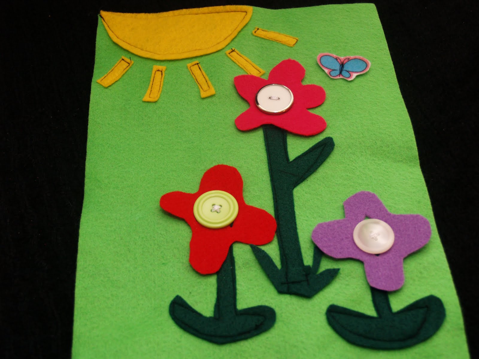 Download and print out my pattern (at the bottom of the post), which, thanks to my husband, actually looks a pattern this time around. Cut out all the stems and the piece of grass in the dark green. Cut one of the flowers in one shape and two in the other. Cut one sun in yellow and cut small pieces to use as the sun rays. I used five sun rays. Sew the sun onto the top left corner along with its rays. Sew the stems on and then hand stitch the buttons onto the page above each stem. DO NOT SEW THE FLOWERS ON! Cut a hole into each flower that is big enough for the button to go through. I made my holes pretty big because my little one is just a toddler, I wanted to make it possible for her. Voila you have a cute flower button page.