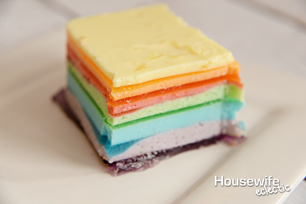 I wanted there to be at least a little bit of balance between the sweet and healthy, so besides rainbow popcorn and cookies we did a large rainbow vegetable food tray. The red layer is cherry tomatoes, the orange is carrots, the yellow is sliced yellow peppers and pear tomatoes. The green layer is cucumbers and broccoli and the purple layer is red onions. In the past for rainbow parties, we have also done a rainbow fruit tray. You can see that here.