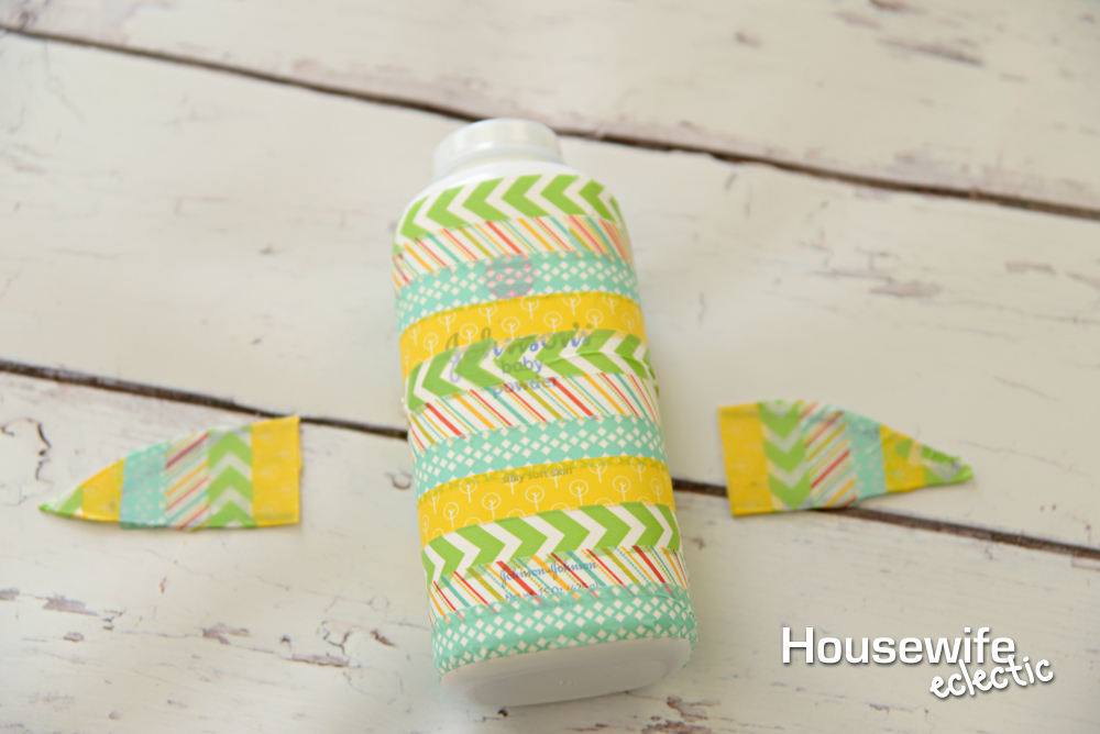 I used four different colors of bright washi tape to make a fun pattern. After your wings and bottle are wrapped, use a small line of hot glue on each wing to attach it to the bottle. Hold the wing in place for about a minute or until it is dried.