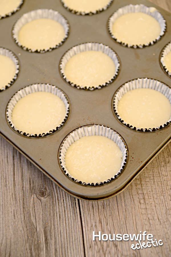 Mix together the cream cheese, sugar, vanilla and eggs together until very smooth. Add a wafer to the bottom of each muffin tin. Sometimes I make mini versions of these with a mini muffin tin and the wafers are the perfect size to fill the bottom.