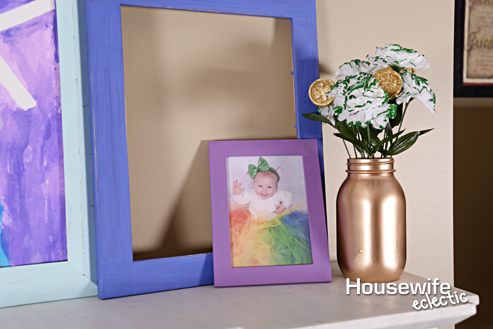 I wanted most of the frames to be open, but I did want a few pictures on the mantel. I made a large rainbow tutu and took pictures of my girls in it for the 5×7 frames. Find the tutu information here. My 7-year-old and I made a large Luck watercolor for the middle frame, find the tutorial here. I sanded and used acrylic paints to paint each of the frames, making sure the largest frame would be in the middle and the 5x7s with the pictures in them would be near the ends. You could fill in all the frames or leave them all open. I love the look with some of the full and some of them open.