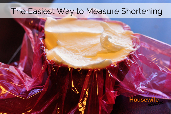 I discovered an awesome trick while watching a friend bake that have saved me a ton of trouble. Before you measure your shortening, place a piece of plastic wrap in your measuring cup. Measure your shortening out and then remove the plastic wrap. Slide the shortening off your plastic wrap and into your mixing bowl. It both ensured all of your shortening made it into your recipe AND keeps you from having to scrub shortening off anything. The perfect combination.