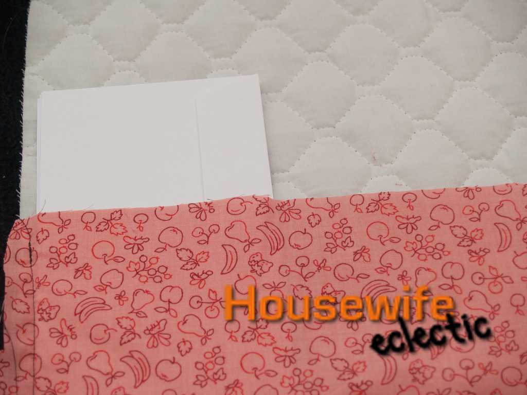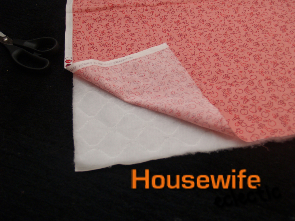 First I cut a piece of fabric and piece of single sided quilted fabric to the same size. I used single sided quilted fabric because I wanted to give the organizer some stiffness.