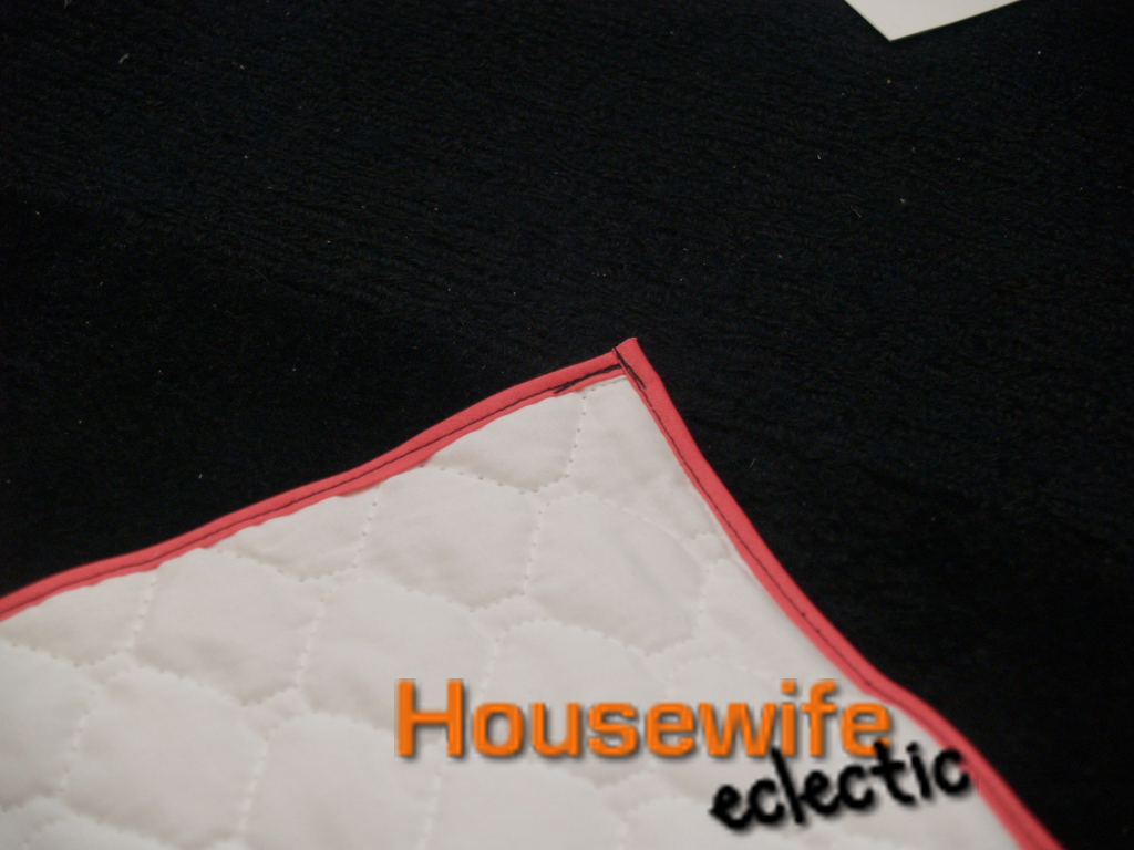 Hem the short piece of pink fabric on one side and then sew it to the quilted fabric on the three side that you did not hem. Make sure your hemmed side is on the top and that you do not sew it down to the quilted fabric.